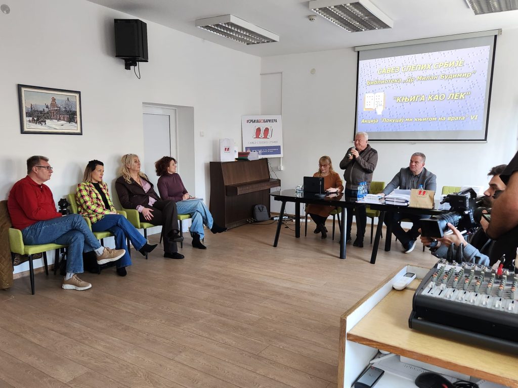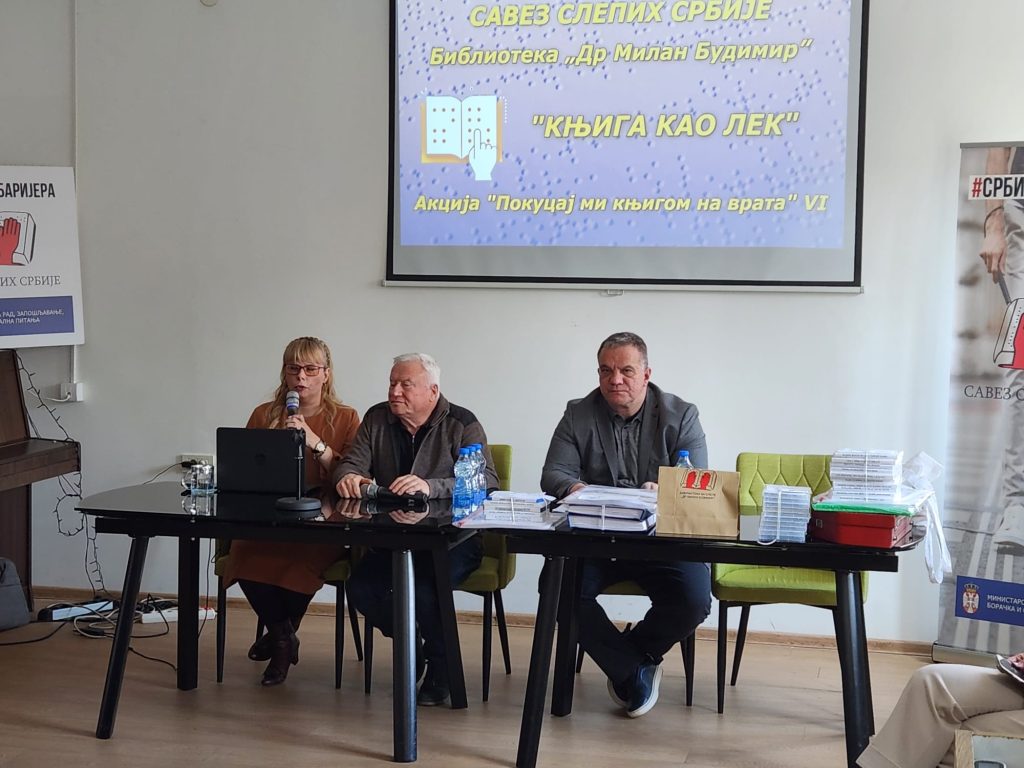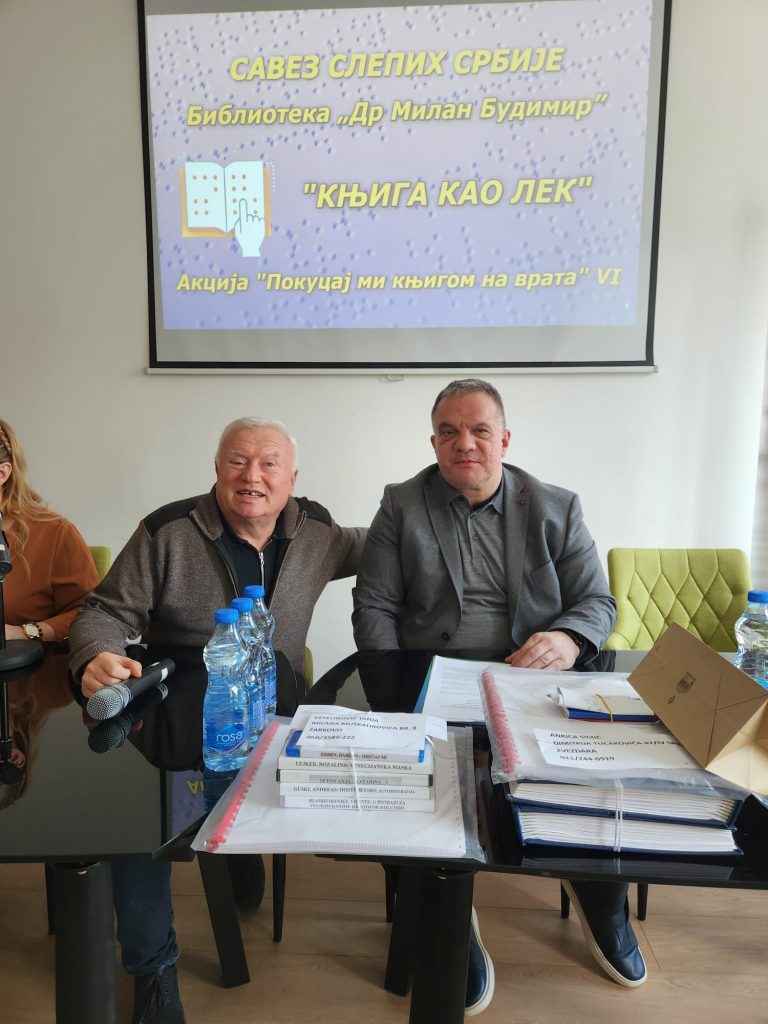 U petak, 27. februara sa početkom u 11 časova, održana je šesta po redu tradicionalna akcija „Pokucaj mi knjigom na vrata“, kojom obeležavamo nacionalni dan knjige. Akcija ove godine nosi simboličan naziv „Knjiga kao lek“. Akcija je počela u svečanoj sali Biblioteke “Dr Milan Budimir” u Jevrejskoj 24, gde su se prisutnim gostima i brojnim saradnicima iz resornih ministarstava, obrazovnih ustanova i delegata njegove svetosti patrijarha srpske pravoslavne crkve Gospodina Porfirija Đakona Dražena Kragića, službenika verskog dobrotvornog starateljstva episkopije Beogradsko-Karlovačke, obratili Predsednik Saveza slepih Srbije Milan Stošić koji je rekao da nije slučajno što akciju ove godine održavamo pod sloganom “Knjiga kao lek”, jer knjiga, osim što predstavlja jedan od temelja obrazovanja, zapošljavanja i egzistencije slepih jeste svakako i lek za dušu i svojevrstan prozor u svet slepim osobama. Knjiga, istakao je on, ima značajnu ulogu u prevazilaženju hendikepa slepoće i uključivanja slepih u savremene društvene tokove.